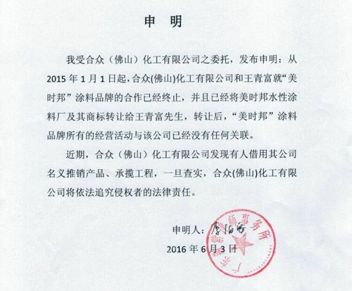 6月3日,广东荆紫律师事务所在《佛山日报》发布申明指出,其受合众化工授权申明:1、从2015年1月1日起,授权人和王青富就“美时邦”涂料品牌的合作已经终止,并且已经将美时邦水性涂料厂及其商标转让给王青富,转让后,“美时邦”涂料品牌所有的经营活动与授权人已经没有任何关联。2、近期,授权人发现有人借用公司名义推销产品、承揽工程,一旦查实,授权人将依法追究侵权者的法律责任。