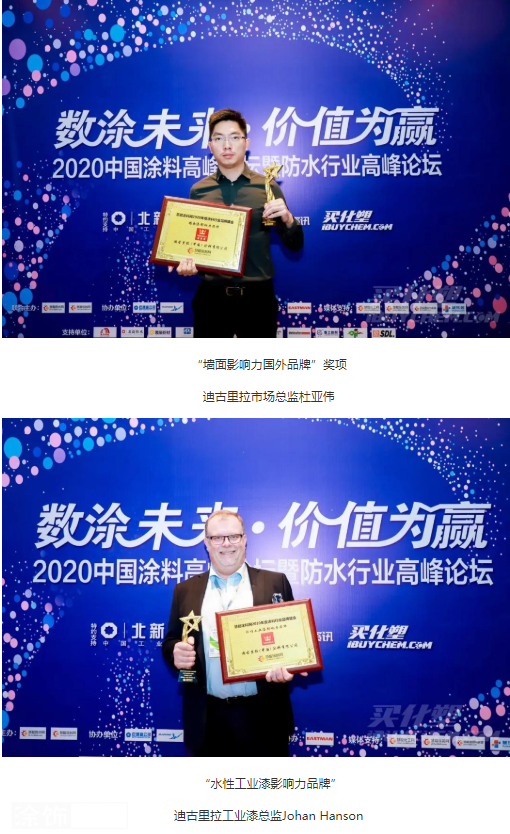 作为行业最具价值的年度盛会,论坛云集了来自世界各地的家装企业、行业专家,共同探讨在全球疫情影响下中国家居行业未来的发展。来自芬兰的涂料品牌芬琳漆(Tikkuirla 迪古里拉)在本次论坛被授予涂料行业”墙面漆影响力国外品牌”和“水性工业漆影响力品牌“奖项。迪古里拉中国区总经理高春林、市场总监杜亚伟、工业漆总监Johan Hanson出席了会议。