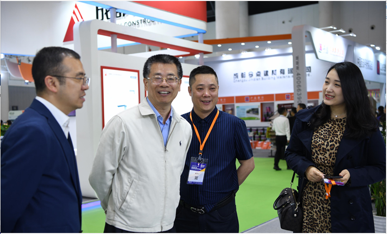 2019年成都建博会现场,展会项目副总经理赵仕阳(右二)陪同中国建筑材料流通协会会长秦占学(左二)、中国建筑材料流通协会秘书长冯斯静(右一)参观展会